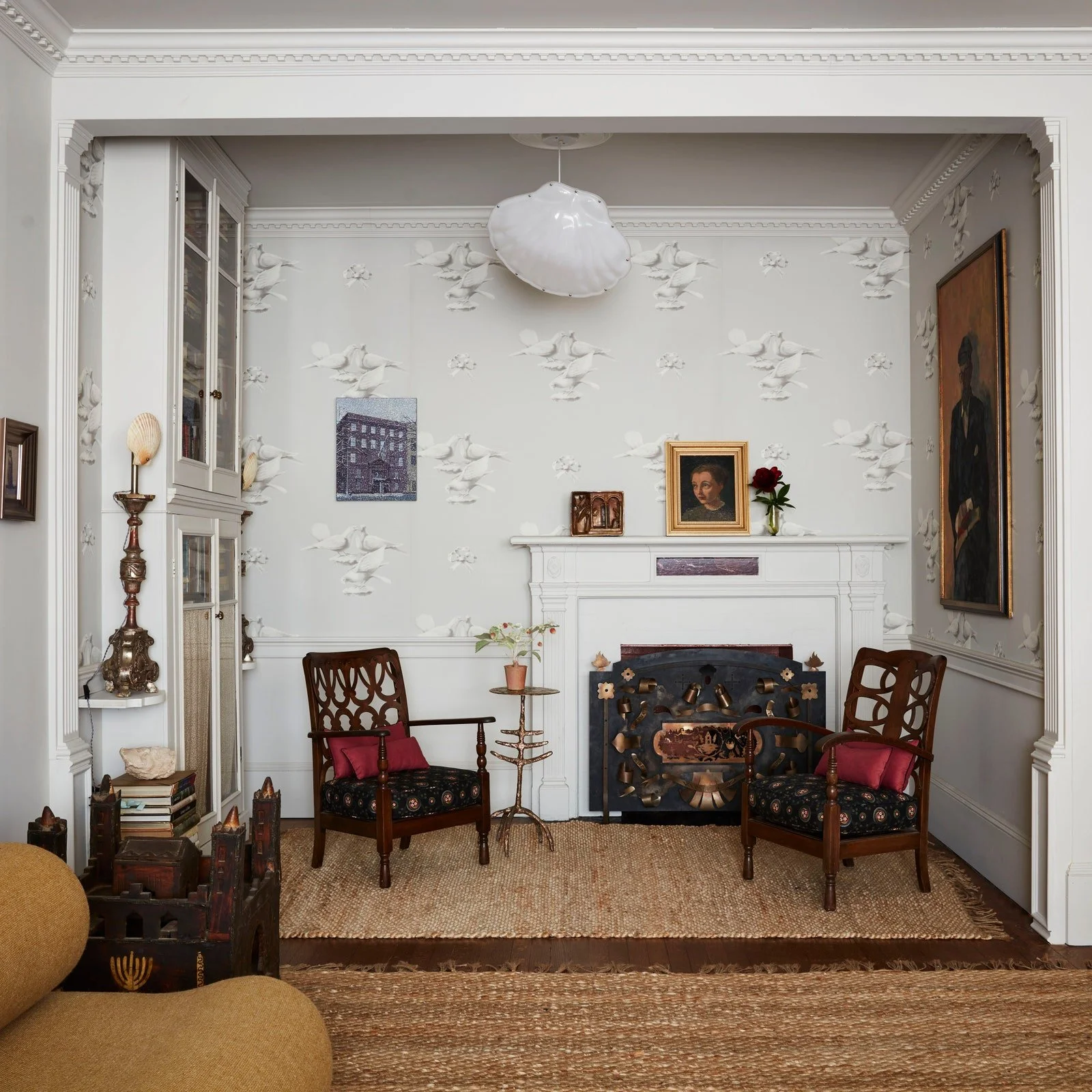 Moving on to the reading nook, we take an especially morbid turn. A portrait too small for the space sits next to a single red flower. Is this a remembrance of a loved one now gone? Also on the wall, an image of an Upper East Side funeral home hangs above a boney end table, sporting a rib cage that might poke a reader in the chair beside it. A large portrait, I believe of the designer’s father, looms opposite the bookcase and watches over him; does he comfort or is he waiting for Carlap Hyman to slip up?